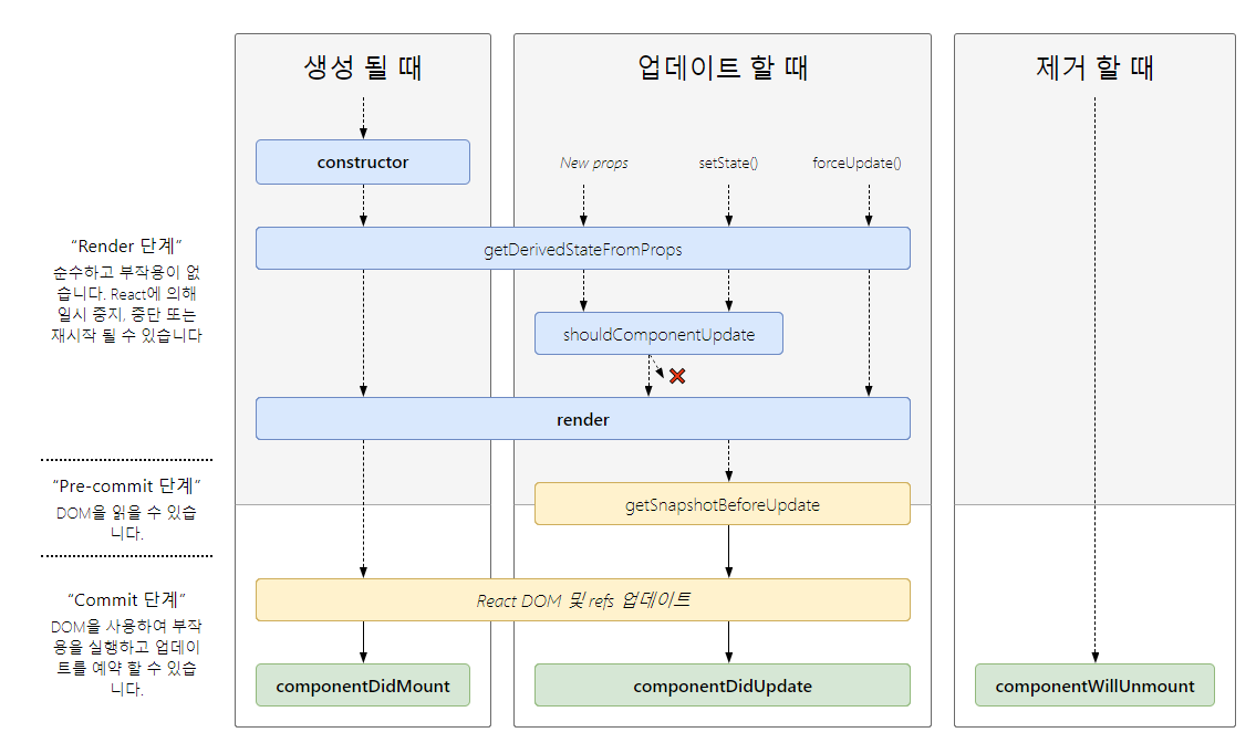 마운팅과 업데이팅 단계에서 메서드 호출 순서를 그림으로 정리하면 다음과 같다.