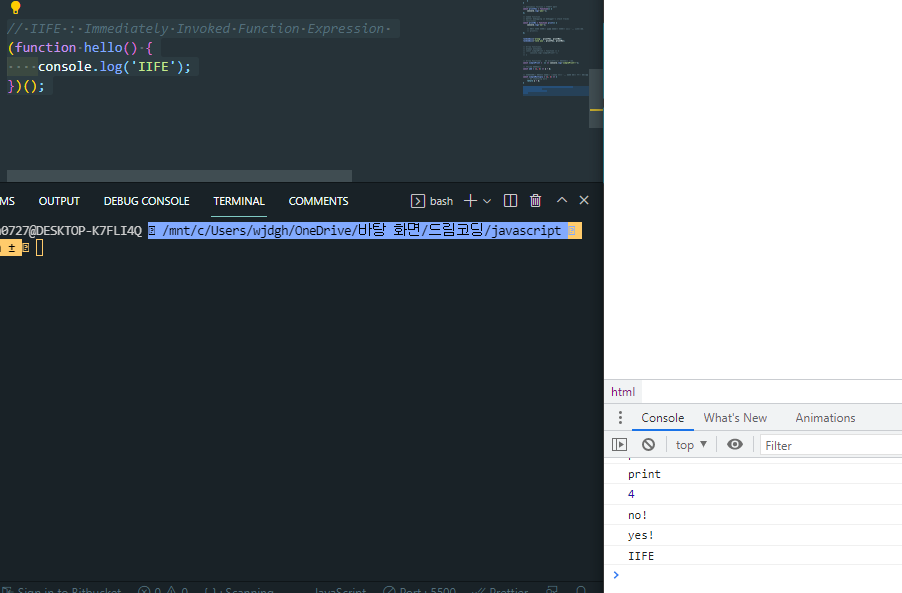 하지만 함수를 선언함과 동시에 호출하려면 위와 같이 함수의 선언을 ()로 묶은 다음에 함수를 호출하듯이 해주면