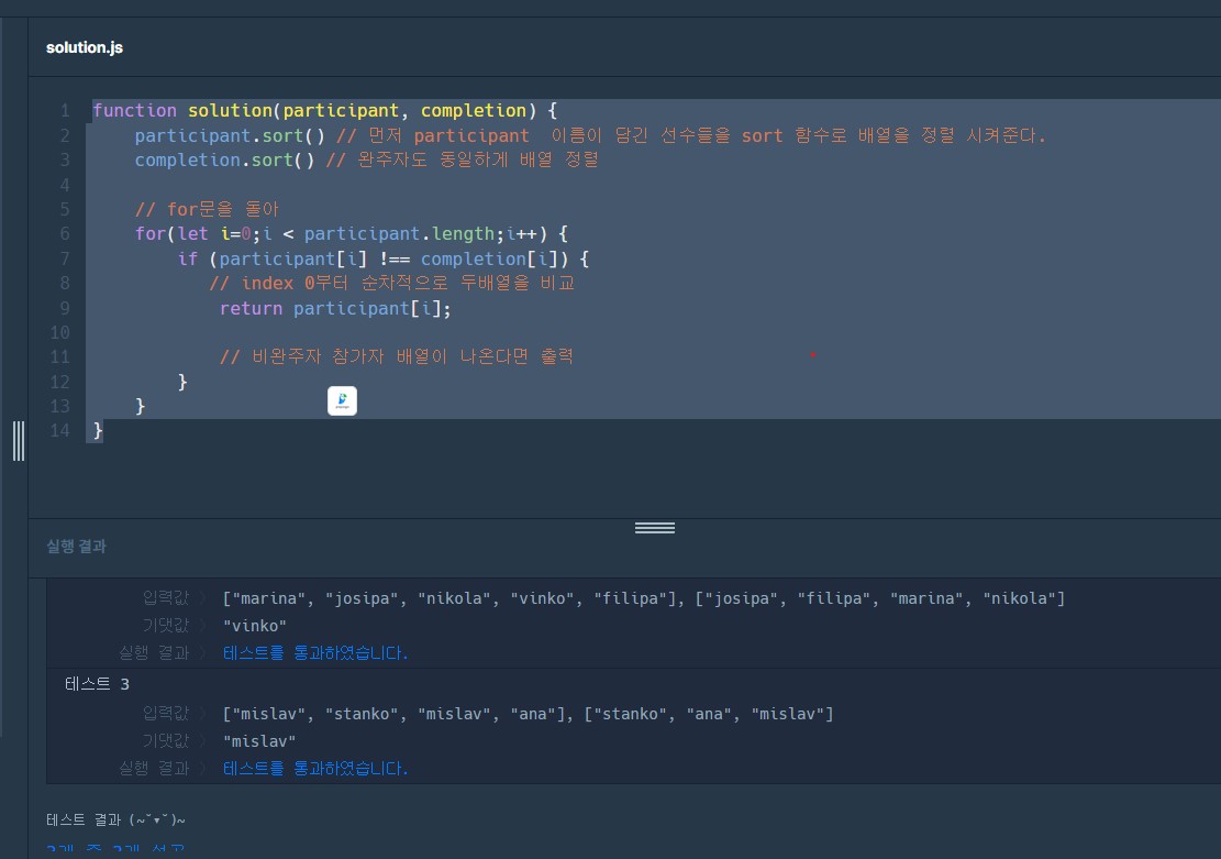 participant(참가자) 배열과 completion(완주자) 배열을 0번부터 비교하다보면 participant(참가자)배열에