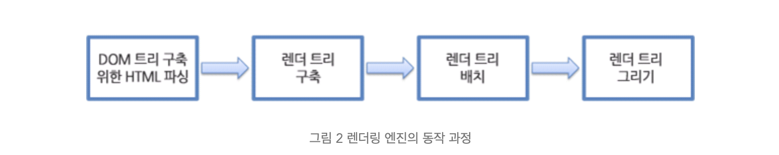 브라우저는 서버로부터 HTML 문서를 응답받으면 렌더링 엔진의 HTML 파서와 CSS 파서에 의한 파싱(parsing)이 되며 DOM,CSSOM 트리로 변환되고 렌더 트리로 결합된다. 이렇게 생성된 렌더 트리를 기반으로 브라우저는 /