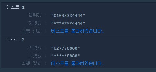 - 전화번호 뒷 4자리를 제외한 나머지 숫자를 전부 *로 가린 문자열을 리턴해준다.