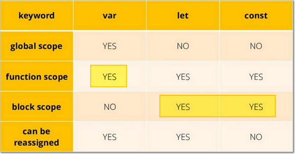 let과 const는 block scope(모든 코드 블록 -if, for 등에서 선언된 변수는 해당 코드 블록 내에서만 유효)임 - var은 재선언 및 재할당이 가능하고, hoisting이 가능하다.