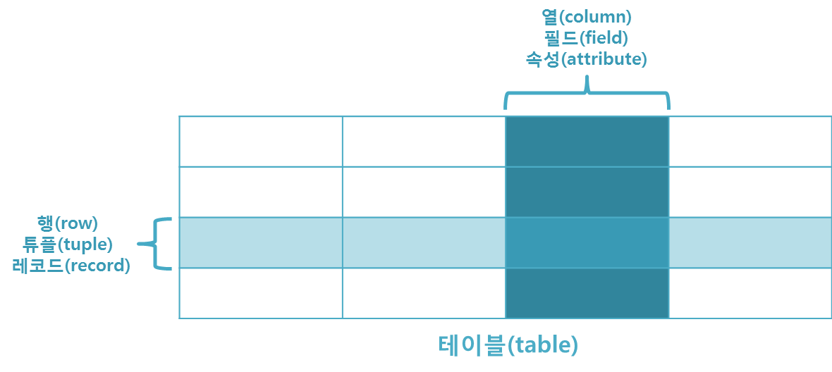 관계형 데이터베이스의 테이블(table)은 다음 그림처럼 구성된다.