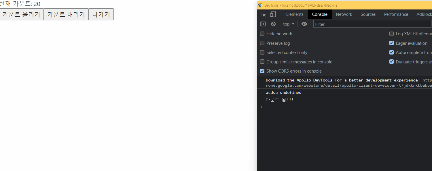 최종적으로 나가기 버튼을 누르면 componentWillUnmount가 실행된다.