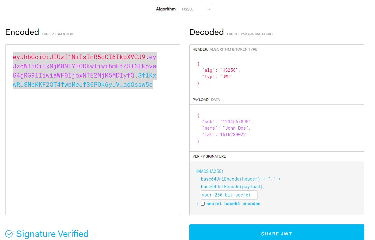 데이터를 모두 묶어 서명처리를 해준다. 그래서 토큰안에 내용을 누구든 볼 수는 있으나 조작할 수는 없다. 조작하기 위해서는 서명할 때 사용한 키가 필요하다.