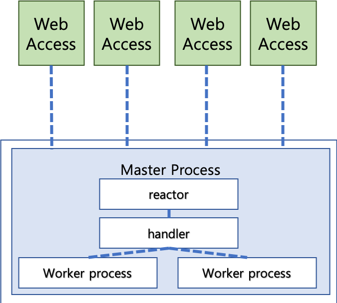 클라이언트 요청 이벤트를 reactor가 받는다, 받은 이벤트는 handler를 통해서 worker로 전달되 처리된다.