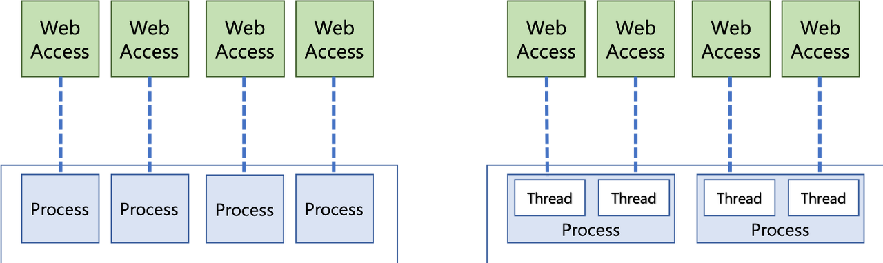 - 클라이언트 연결이 늘어남에 따라서 프로세스가 계속해서 늘어나 메모리 낭비가 심하며 문맥 교환 비용이 든다.