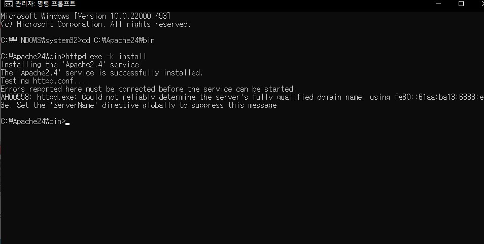 cmd에서 해당 경로로 이동해주세요. 해당 경로로 이동했다면 아래 명령문을 이용해 Apache를 설치해주세요.