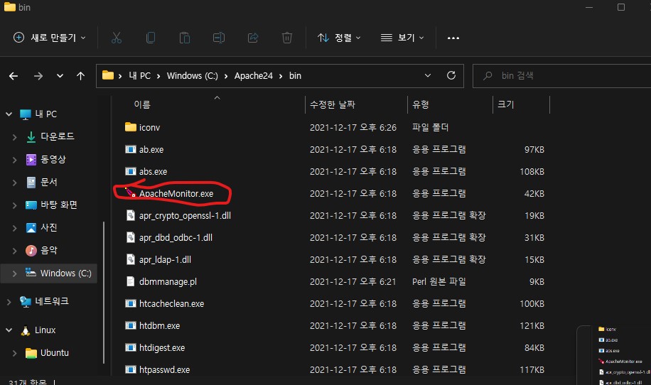 - Apache24/bin 경로로가 ApacheMonitor.exe 파일을 실행시켜주세요