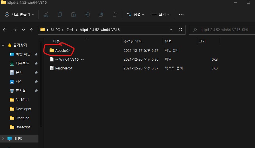 다운 받은 압축파일을 풀어주고 Apache24 폴더를 C:드라이브 경로로 이동해주세요