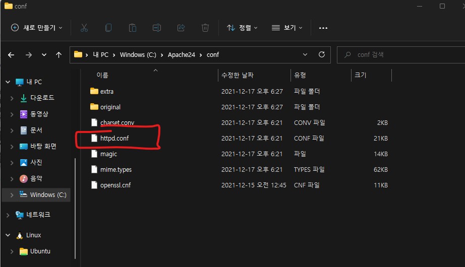 C 드라이브로 옮긴 Apache24/conf 경로에서 httpd.conf 파일을 메모장으로 열어 편집해주세요