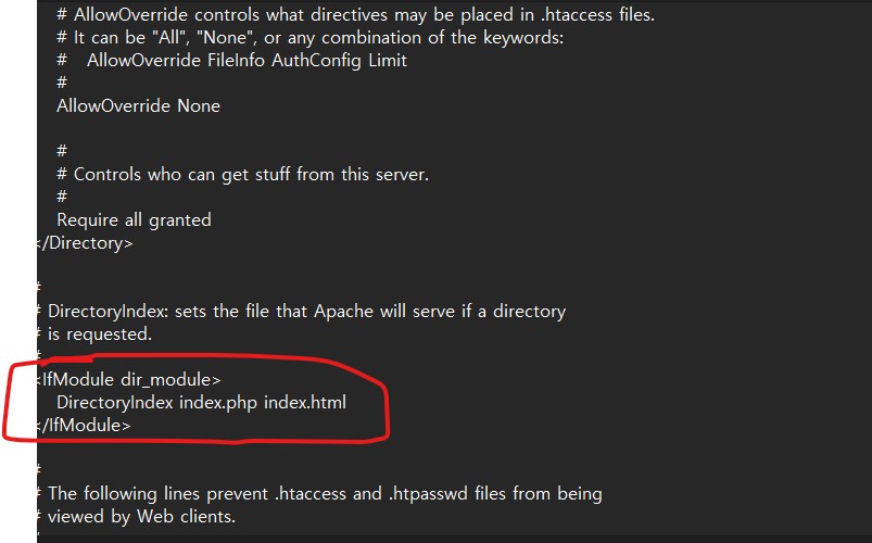 먼저 C:/Apache24/conf/httpd.conf 파일의 DirectoryIndex 부분의 index.php를 추가해줍니다.
