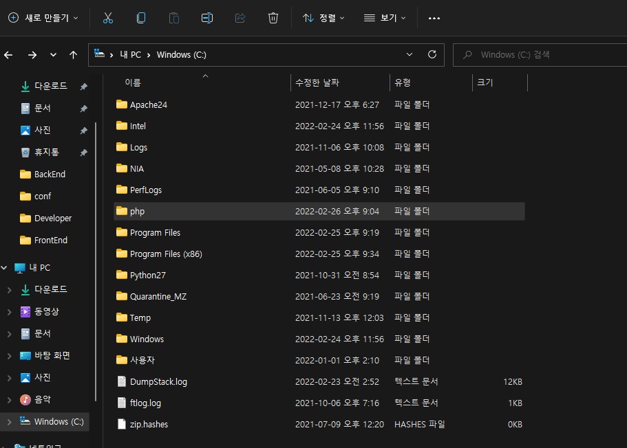 C드라이브에 간단하게 php폴더를 만들어주고 php 폴더 앞축을 풀고 폴더에서