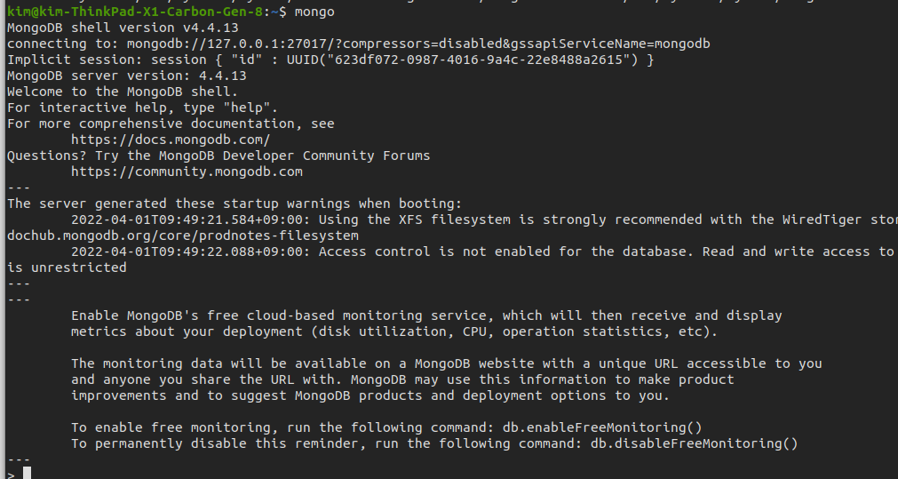 정상적으로 MongoDB가 실행 중이면 다음 명령어로 MongoDB에 접속해 작업을 시작할 수 있다.