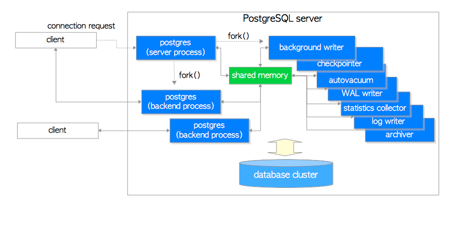 PostgreSQL은 클라이언트/서버 모델을 사용하고 있습니다. 서버는 데이터베이스 파일들을 관리하며, 클라이언트