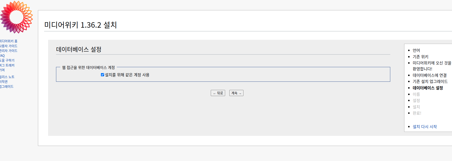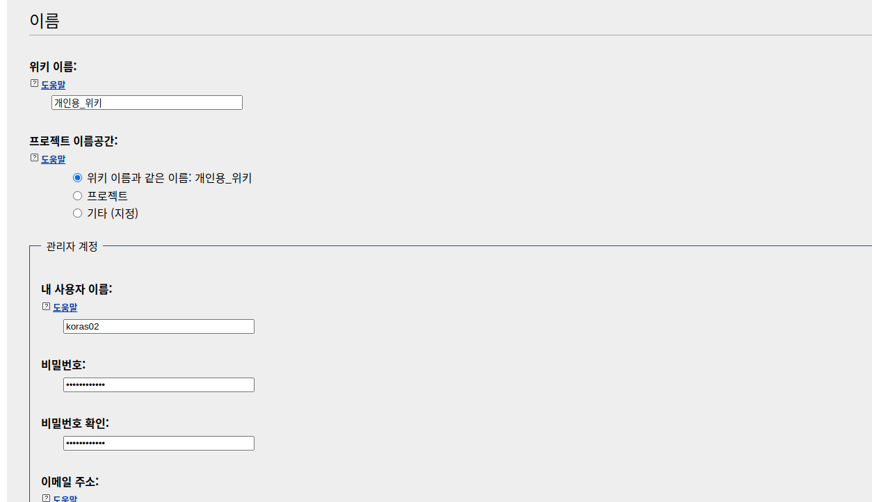 여기서 위키의 이름과 관리자계정을 생성합니다.