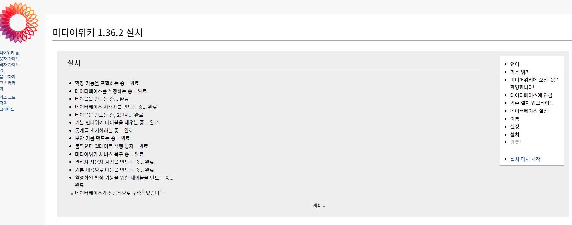 이제 여기서 계속 버튼을 누름과 동시에 LocalSettings.php 파일이 받아지는데요