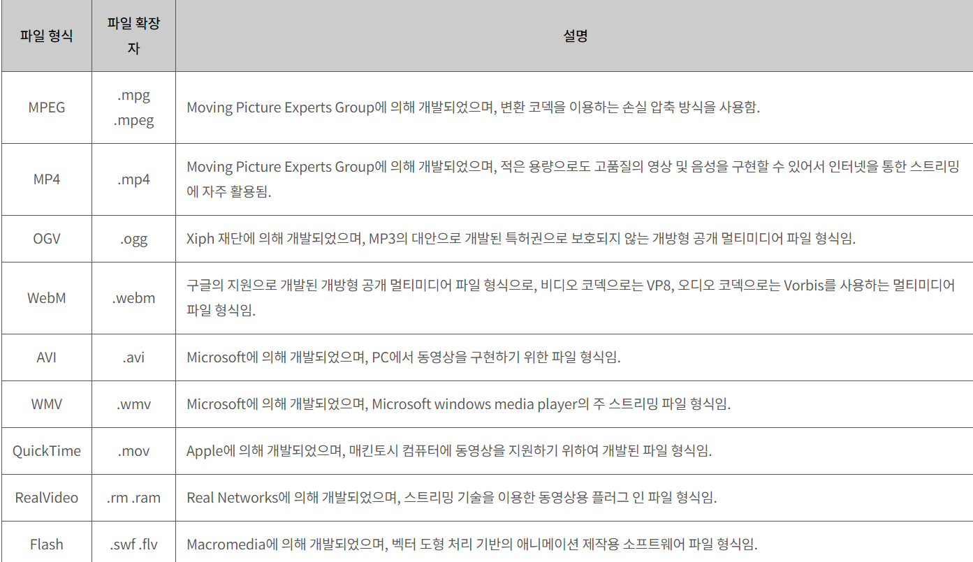 - WebM: 구글의 지원으로 개방된 개방형 공개