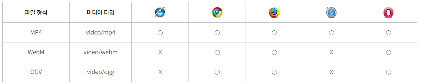 HTLM5 비디오 파일 형식별 주요 웹브라우저의
