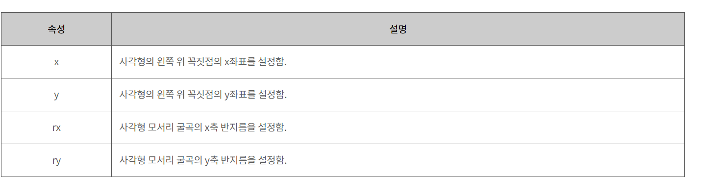 모서리가 둥근 사각형을 그리는데 사용하는 rect 요소의 속성은 다음과 같습니다.