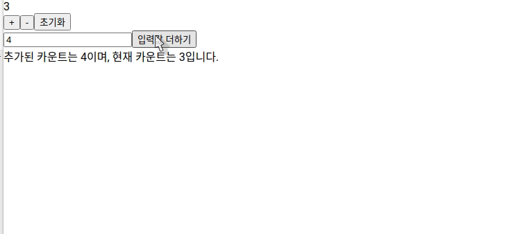 값을 + 버튼을 누르고 text에 입력값 4를 하고 버튼을 누를때 현재 카운트와 합산해서 더해주는 것을 볼수 있습니다.