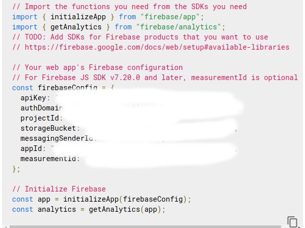왼쪽 상단 톱니바퀴를 누르면 프로젝트 설정이 뜹니다. 프로젝트 설정에 가셔서 스크롤 내리시면 SDK 설정 및 구성이라는 곳에 가면 Config키들이 있으니 apiKey에서부터 measurmentid 까지 복사하세요