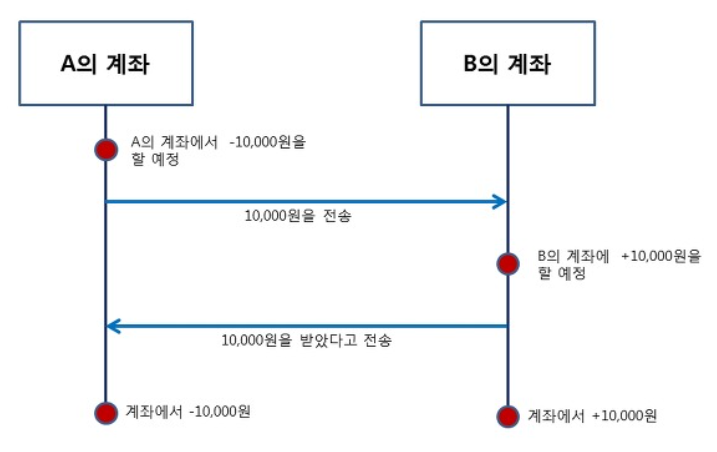 순서를 보면 아시겠지만 A의 계좌와 B의 계좌는 서로 요청과 응답을 확인한 후 같은 일을 동시에 진행하였습니다.