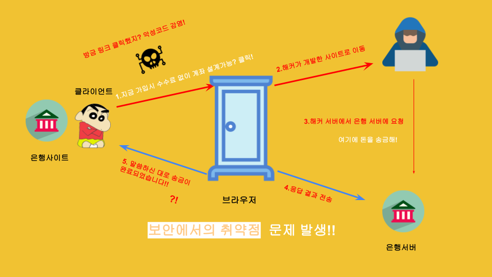 해커가 원하는 요청대로 클라이언트가 요청한 것으로 이루어지는 보안상 문제점이 발생해버립니다.