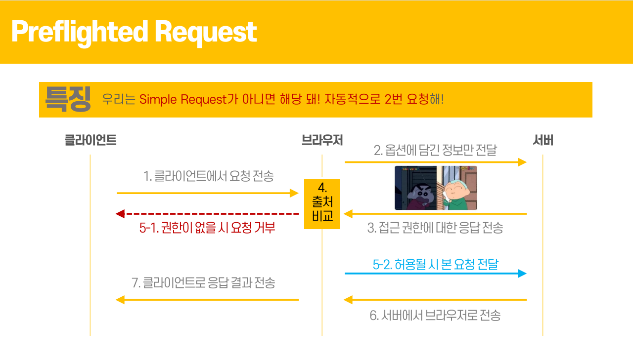 - 보안 정책상 검증이 필요한 상황에 해당하면 CORS 검증을 서버에 요청한다. (Preflight Request)