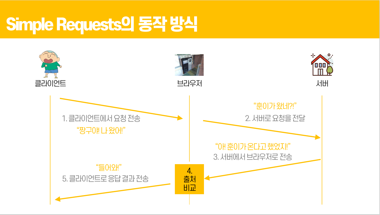 - CORS의 비교 주체는 브라우저라는 점을 꼭 명심해줘야 한다! 이에 대한 조건 충족 여부에 따라 단순 요청, 사전 요청 등을 자동으로 수행하기 떄문이다.